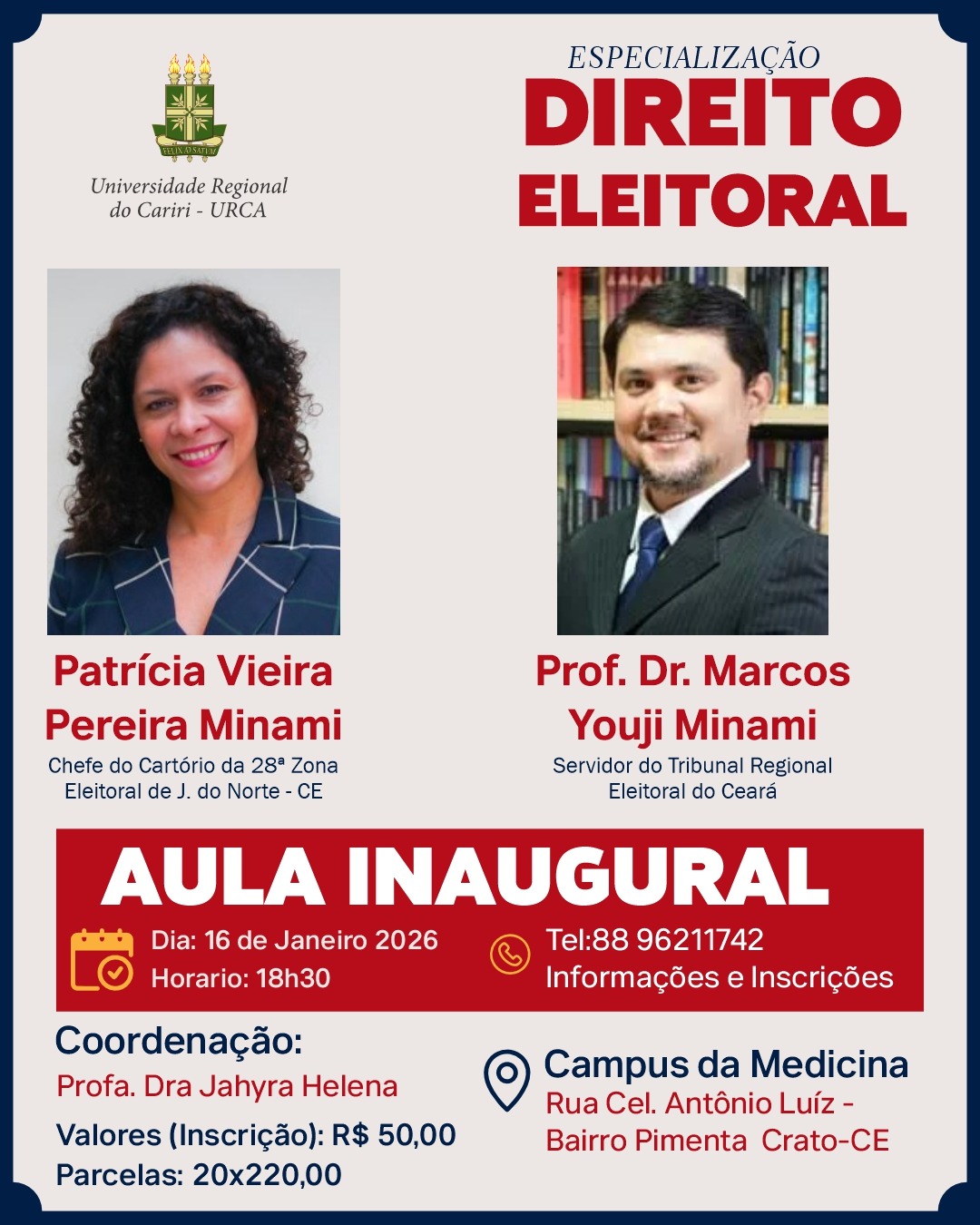 A Universidade Regional do Cariri (URCA) realizará, no dia 16 de janeiro de 2026, a aula inaugural da Especialização em Direito Eleitoral, que marca o início de mais um curso de pós-graduação ofertado pela instituição.