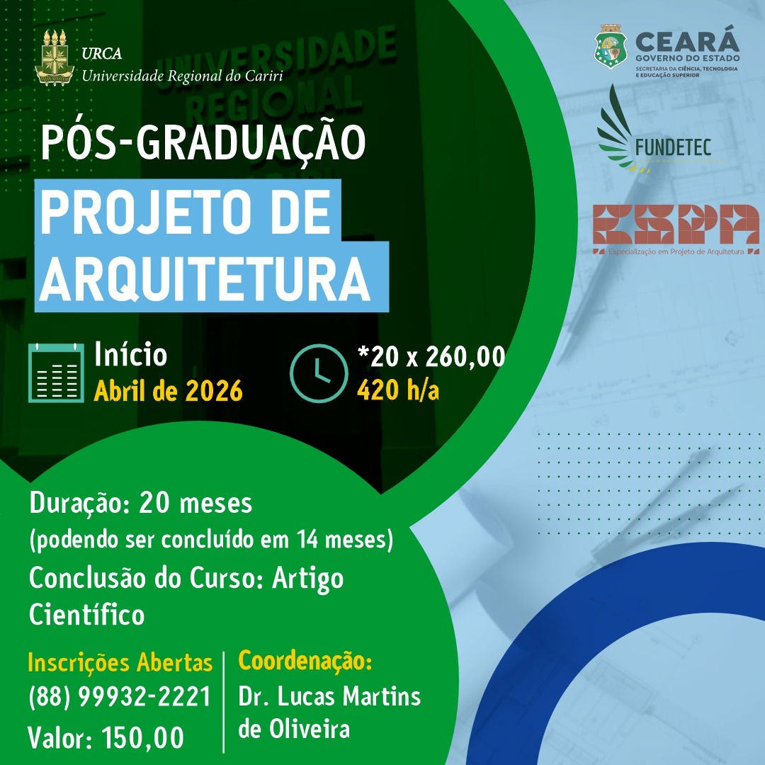 A Universidade Regional do Cariri (URCA) conta com um novo curso de pós-graduação, a Especialização em Projeto de Arquitetura, aprovada nesta última quinta-feira (26/02), através da resolução 06/2026. O curso será coordenado pelo professor Dr. Lucas Martins de Oliveira, do curso de Arquitetura e Urbanismo – Departamento de Construção Civil. A especialização possui carga horária de 360h, é semi-presencial, e conta com encontros mensais on-line, realizados em um final de semana por mês, sextas, sábados e domingos, sendo os dois últimos módulos presenciais no Campus Crajubar.