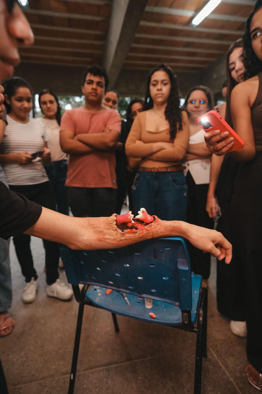 Um dos momentos mais impactantes da jornada foi a intersecção entre a saúde e as artes cênicas. Em parceria com o Estúdio Traquejo, os participantes vivenciaram a experiência do “paciente padronizado”. A apresentação revelou como o teatro pode humanizar e tornar o ato de cuidar mais visceral e autêntico. Complementando esse universo sensorial, a Mostra de Moulage e Maquiagem Realística demonstrou como a fidelidade visual é essencial para a eficácia da aprendizagem baseada em simulação.