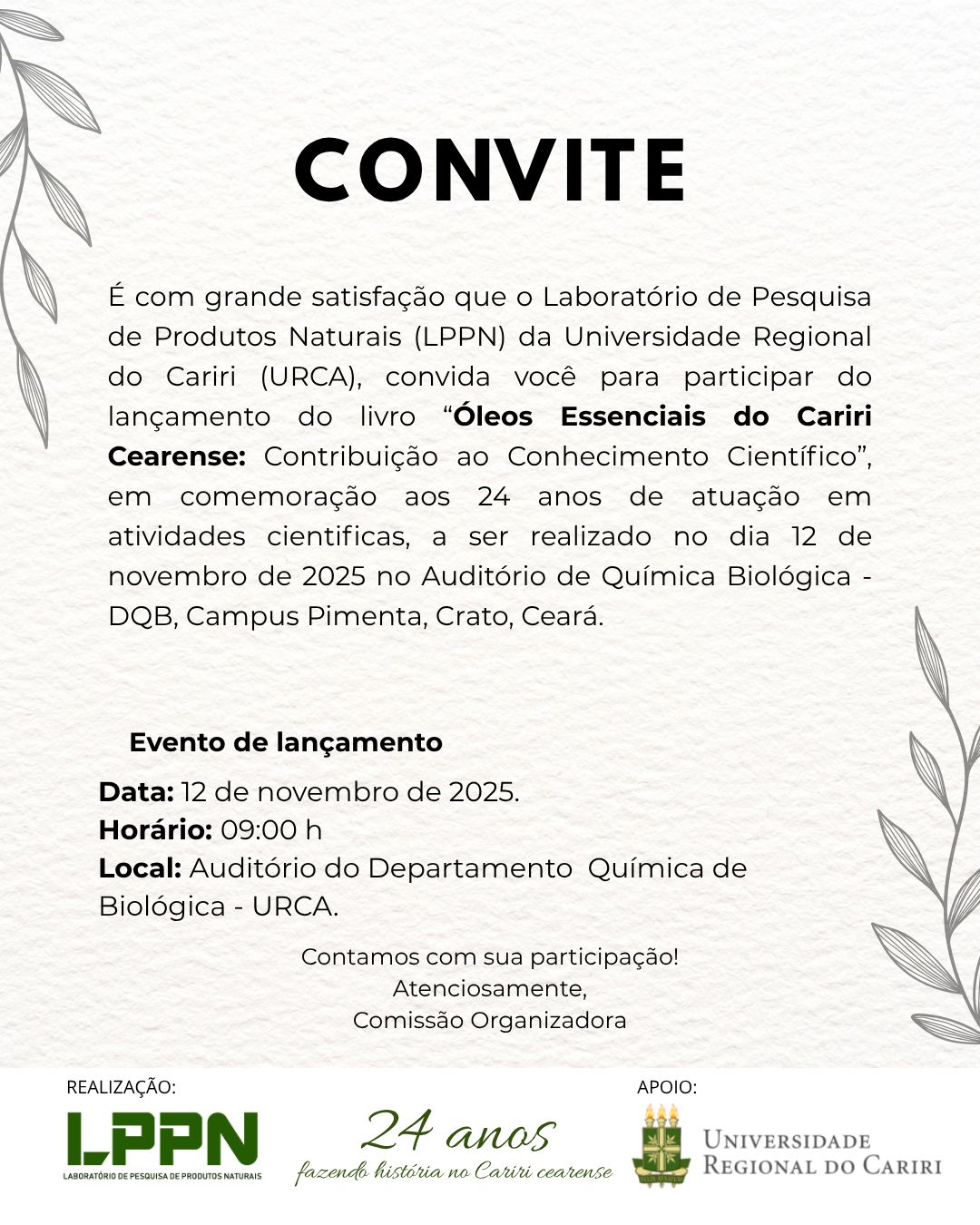 O Laboratório de Pesquisa de Produtos Naturais (LPPN) da Universidade Regional do Cariri (URCA) realizará, no dia 12 de novembro de 2025, o lançamento do livro “Óleos Essenciais do Cariri Cearense: Contribuição ao Conhecimento Científico”. O evento faz parte das comemorações pelos 24 anos de atuação do laboratório em pesquisas científicas que contribuem para o desenvolvimento da região.