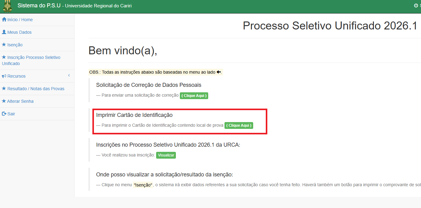Os candidatos ao Processo Seletivo Unificado 2025.2 Demais Campus e 2026.1 Iguatu e Mauriti que ainda não emitiram seu cartão de identificação, o link pra impressão encontra-se na primeira página do sistema.