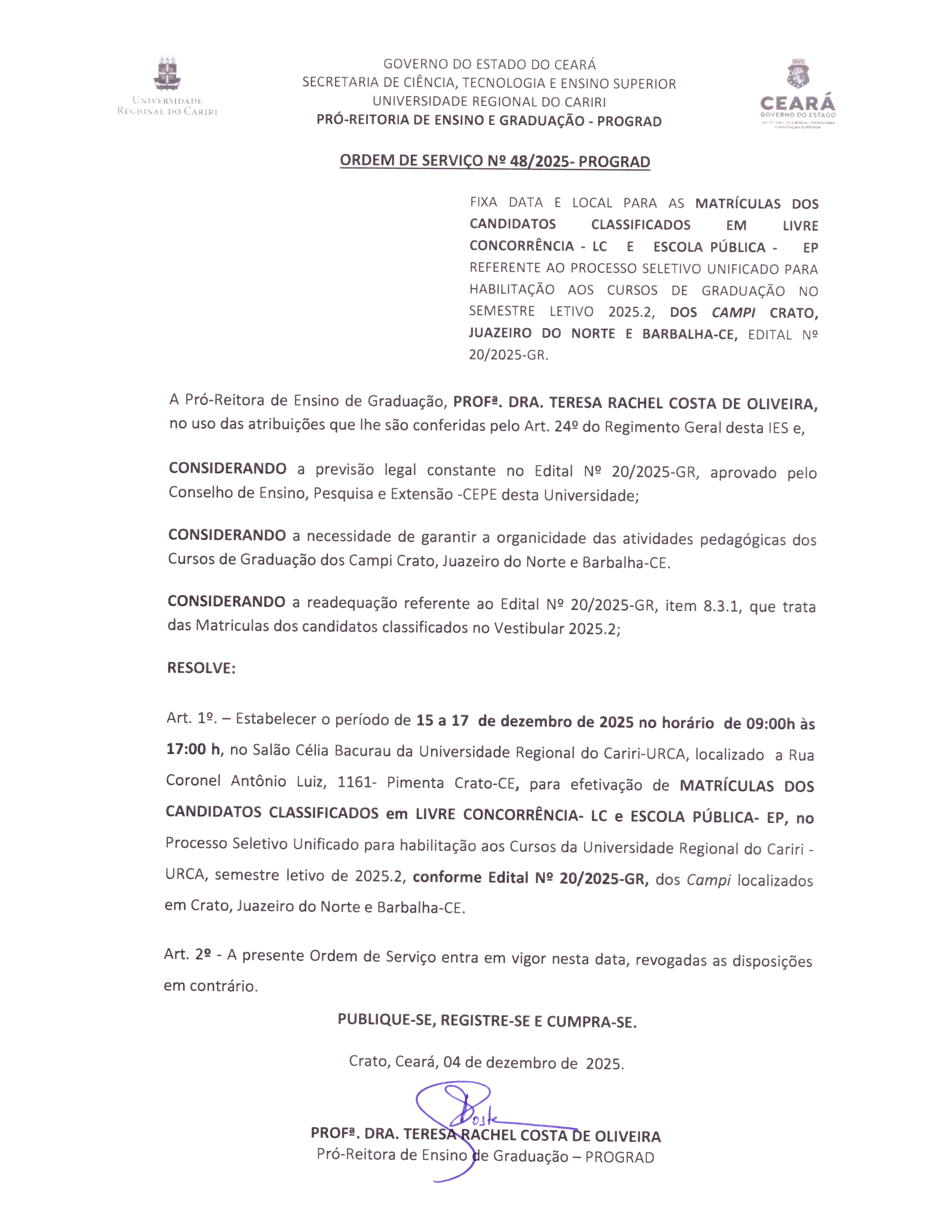 12/12/2025 – ORDEM DE SERVIÇO 50/2025 – Comunicado Matrícula dos Candidatos de Escola Pública – (Clique aqui)